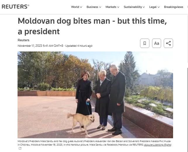 中新網(wǎng)11月17日電 據(jù)路透社援引摩爾多瓦媒體消息,當(dāng)?shù)貢r(shí)間16日,摩爾多瓦總統(tǒng)桑杜的愛(ài)犬在總統(tǒng)官邸咬傷了到訪的奧地利總統(tǒng)范德貝倫。
