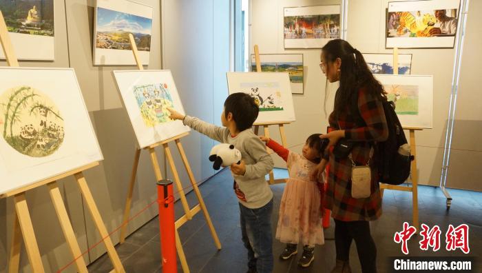 圖為觀眾及小朋友欣賞獲獎作品展。柏林中國文化中心供圖