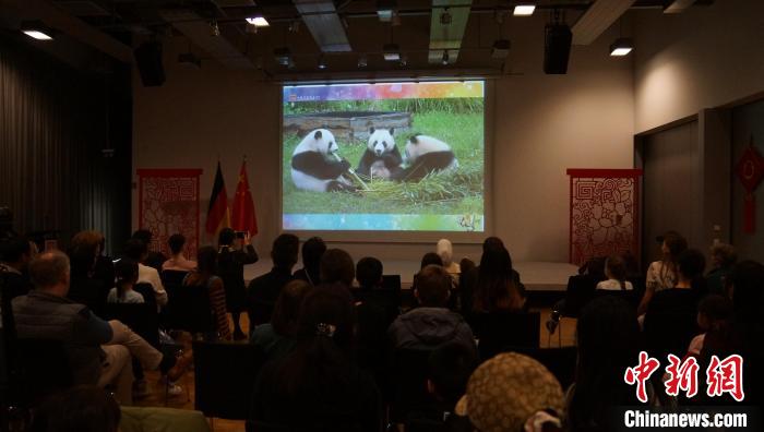圖為現(xiàn)場播放柏林動物園大熊貓雙胞胎成長紀錄片。柏林中國文化中心供圖