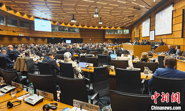 11月22日,中國常駐國際原子能機構(gòu)代表李松率團出席在維也納召開的國際原子能機構(gòu)11月理事會,就巴以沖突和以色列核問題發(fā)言。圖為會議現(xiàn)場。 中新社發(fā) 中國常駐維也納代表團供圖
