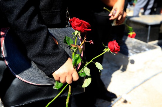 10月14日,黎巴嫩南部希亞姆鎮(zhèn),黎巴嫩記者手持玫瑰為在以色列轟炸中死亡的攝影記者伊薩姆·阿卜杜拉送葬。新華社發(fā)(阿里·哈希紹攝)