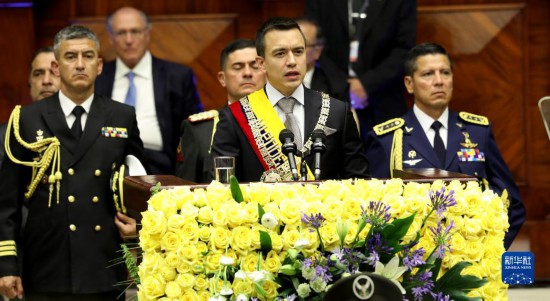 11月23日,厄瓜多爾當選總統(tǒng)丹尼爾·諾沃亞(中)在首都基多發(fā)表就職演講。厄瓜多爾當選總統(tǒng)丹尼爾·諾沃亞23日在首都基多宣誓就職,任期至2025年5月。新華社發(fā)(厄瓜多爾總統(tǒng)府供圖)
