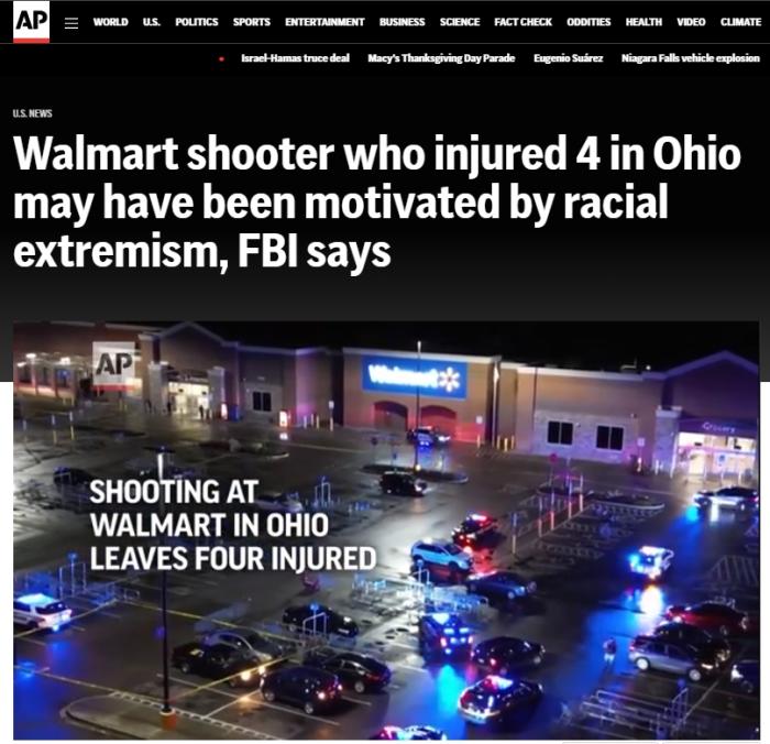 FBI稱,當(dāng)?shù)貢r(shí)間20日晚上,美國俄亥俄州代頓市郊區(qū)的一家沃爾瑪發(fā)生槍擊事件,四名購物者受傷,包括兩名黑人女性、一名白人女性和一名白人男性。