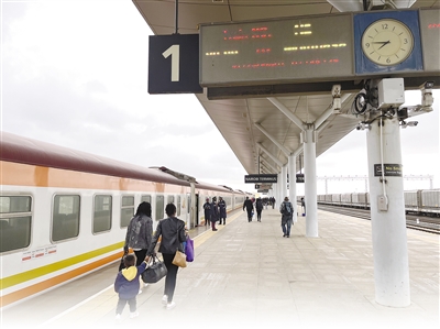 由中國路橋工程有限責(zé)任公司承建的蒙內(nèi)鐵路是肯尼亞獨(dú)立以來建設(shè)的首條鐵路,也是一條采用中國標(biāo)準(zhǔn)、中國技術(shù)、中國裝備建造的現(xiàn)代化鐵路,被譽(yù)為中國和肯尼亞共建“一帶一路”標(biāo)志性工程。圖為蒙內(nèi)鐵路列車停靠在內(nèi)羅畢站。