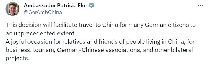 德國(guó)駐華大使傅融(Patricia Flor)在社交媒體平臺(tái)寫道:“這一決定將在前所未有的程度上為德國(guó)公民前往中國(guó)帶來(lái)便利。無(wú)論是在華的商務(wù)人士、旅游人士、德中協(xié)會(huì)以及從事其他雙邊項(xiàng)目的朋友,這都是一個(gè)歡樂時(shí)刻?!?/p>