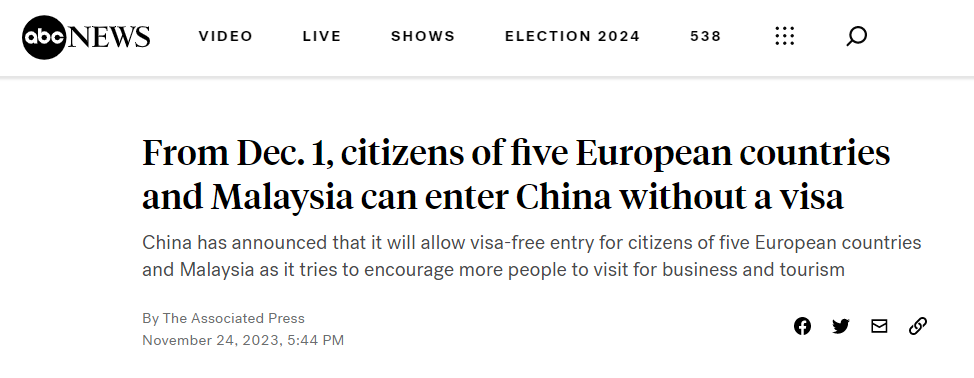 路透社報(bào)道稱,中國(guó)外交部宣布,2023年12月1日至2024年11月30日期間,上述國(guó)家持普通護(hù)照人員來(lái)華經(jīng)商、旅游觀光、探親訪友和過境不超過15天,可免辦簽證入境。