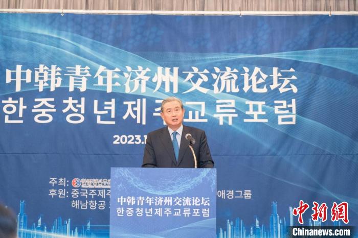 11月30日,中韓青年濟(jì)州交流論壇在韓國濟(jì)州舉行。圖為中國駐濟(jì)州總領(lǐng)事王魯新致賀詞。韓中青年友好協(xié)會 供圖