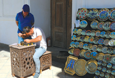 在布哈拉雅克城堡內,手工藝人正在制作極具當?shù)靥厣氖止に嚻贰?/p>