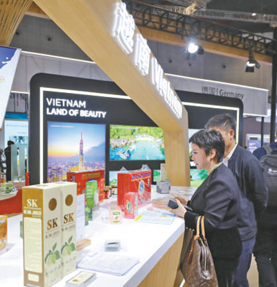 11月6日,參觀者在第六屆進(jìn)博會(huì)國家展越南展臺(tái)挑選商品。
