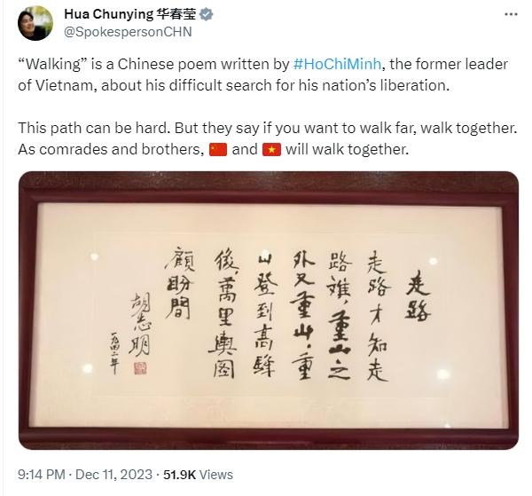 華春瑩寫道,“《走路》是越南老一輩領(lǐng)導(dǎo)人胡志明所寫的一首漢語詩,講述了他爭取國家解放的艱難歷程。這條路可能很艱難。但人們說,如果想走得遠,就要一起走。作為同志和兄弟,中國和越南將一路同行。”