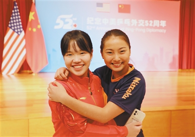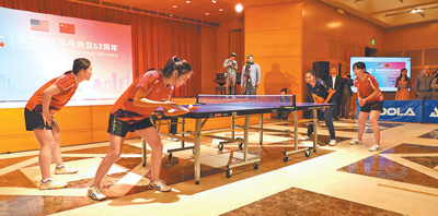 中美乒乓球運(yùn)動(dòng)員進(jìn)行表演賽。