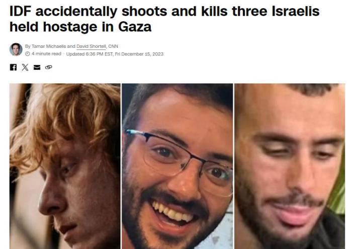 據(jù)美國有線電視新聞網(wǎng)(CNN)報道,以色列國防軍發(fā)言人赫格里在新聞發(fā)布會上表示,“在謝賈亞的戰(zhàn)斗中,以色列國防軍錯誤地將三名以方人質(zhì)視為威脅。軍隊向其開火,他們被打死?!?/p>