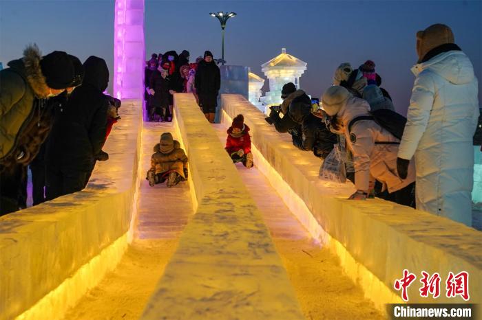 小朋友在哈爾濱冰雪大世界體驗冰滑梯 趙宇航 攝