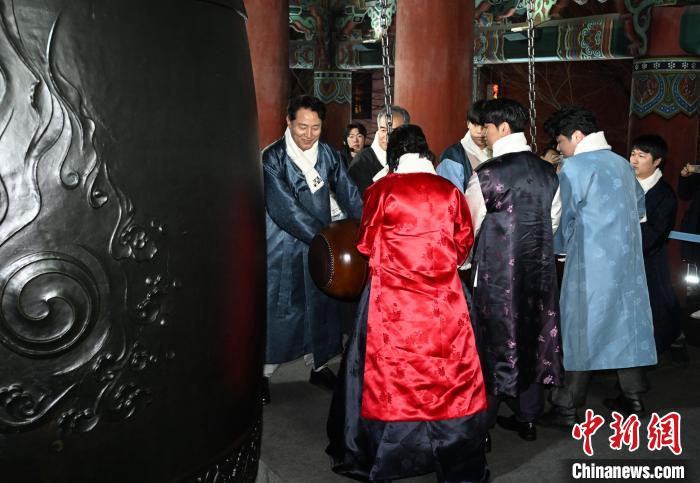 受疫情影響暫停的普信閣新年撞鐘活動時隔4年重新向市民開放。當(dāng)?shù)貢r間1日0時,首爾市長吳世勛、公開推選出的12名市民代表和6名全球網(wǎng)絡(luò)紅人等22人分為4組撞鐘33次,宣布2024年的到來。
