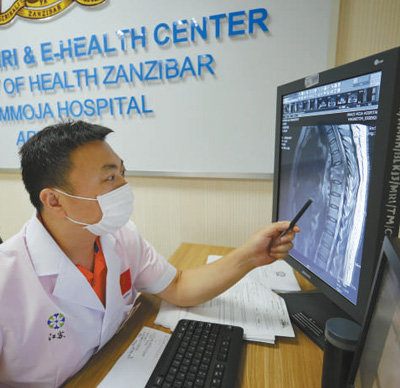 從第一臺X光機、CT設備,再到目前整個桑給巴爾地區(qū)唯一一臺核磁共振機,納茲莫加醫(yī)院影像科的設備物資都來自中國捐贈。不久前,影像科還增添了遠程視頻設備。通過遠程技術,中國醫(yī)療隊可以對接中國國內優(yōu)質醫(yī)療資源,對當?shù)貜碗s病例進行在線會診。桑給巴爾地區(qū)現(xiàn)有的5名影像科醫(yī)生,就是在一批批中國醫(yī)療隊隊員的帶教下成長起來的。