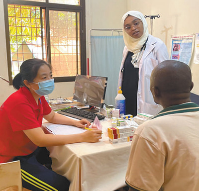 醫(yī)療隊在桑給巴爾島開展義診,圖為內科醫(yī)生劉翠霞(左一)接診患者。