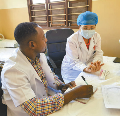 醫(yī)療隊在奔巴島開展義診,圖為婦產科醫(yī)生史曉瑩(右)同當?shù)蒯t(yī)生交流患者情況。