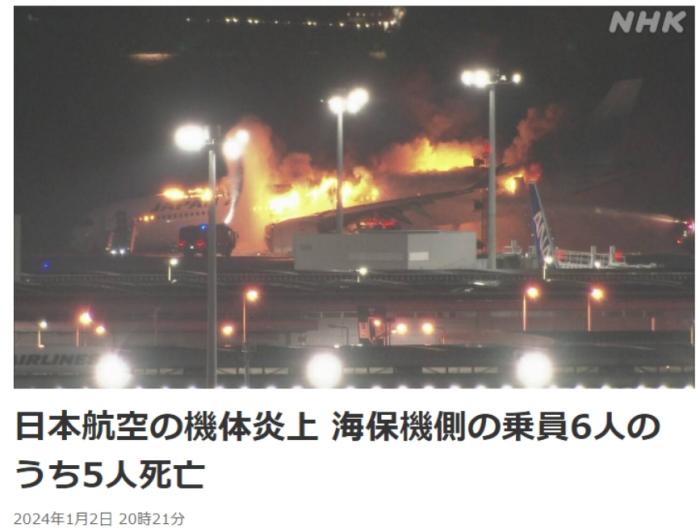 中新網(wǎng)1月2日電 據(jù)日本廣播協(xié)會(NHK)報道,東京警視廳的消息稱,與日航客機相撞的海上保安廳固定翼飛機上5人已確認(rèn)死亡,機長被確認(rèn)受重傷。