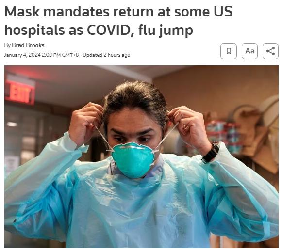 中新網(wǎng)1月4日電 據(jù)路透社當?shù)貢r間3日報道,由于新冠病毒和季節(jié)性流感等呼吸道疾病病例激增,美國至少有四個州的醫(yī)院重啟“口罩令”。紐約州、加利福尼亞州、伊利諾伊州和馬薩諸塞州的醫(yī)療衛(wèi)生機構恢復要求醫(yī)護人員和病患戴口罩的規(guī)定。