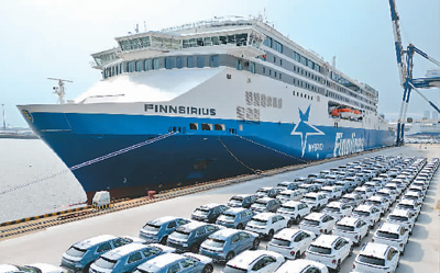 2023年7月25日,油電混合動力高端客滾船“Finnsirius”號在山東港口煙臺港裝載商品車。