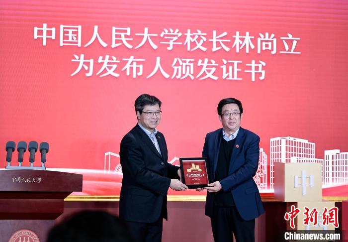 中國(guó)人民大學(xué)校長(zhǎng)林尚立為本次活動(dòng)成果發(fā)布人頒發(fā)證書。