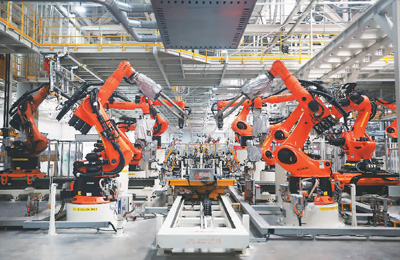 圖為在安徽合肥拍攝的大眾安徽模塊化電驅(qū)動平臺工廠車身車間一角。