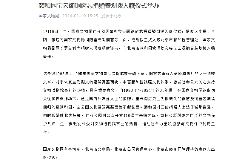 這是繼1993年、1995年國家文物局兩次促成寶云閣銅窗、銅窗芯重新入藏頤和園后的又一捐贈義舉,對于恢復(fù)寶云閣文物建筑完整面貌、豐富頤和園館藏文物體系、激發(fā)社會公眾關(guān)心支持文物博物館事業(yè)的熱情,具有重要意義。自1993年至2024年的31年間,在國家文物局的殷切關(guān)注和積極推動下,通過國內(nèi)外友好人士的捐贈,寶云閣歷史上失散流失的銅窗及銅窗芯陸續(xù)回歸入藏頤和園,寶云閣文物建筑完整面貌不斷恢復(fù)。頤和園對三位捐贈人表達了誠摯謝意,同時希望以此為契機,在頤和園對公眾開放110周年來臨之際,宣揚和凝聚更為廣泛的文物保護共識,進一步激發(fā)公眾對文物博物館事業(yè)的熱情,推動社會力量積極參與文物保護利用工作。