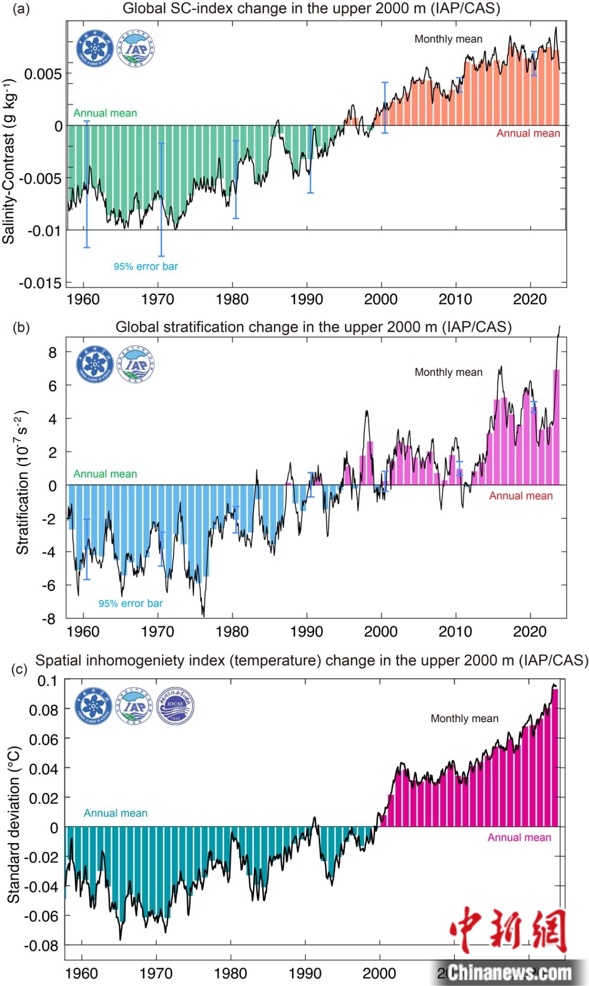 1958-2023年全球海洋上層2000米鹽度差指數(shù)SC(a)、層結(jié)(b)、溫度空間非均勻性指數(shù)(c)變化時(shí)間序列。黑色線條為月度變化,條狀色條為年變化。中國(guó)科學(xué)院大氣物理研究所/供圖