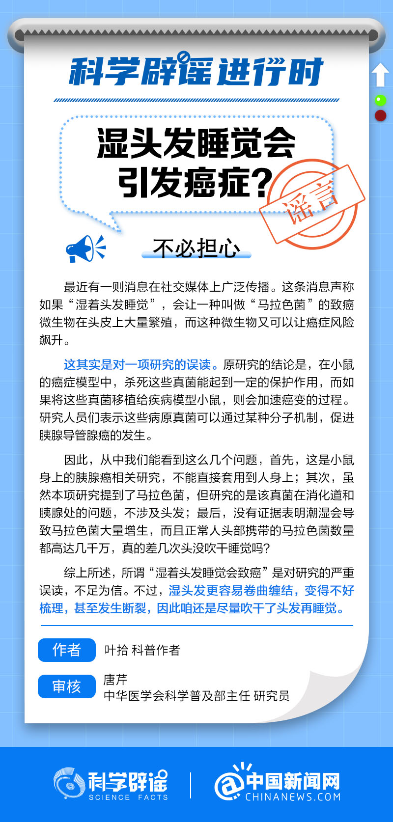 中新網(wǎng)1月15日電 最近有消息稱,如果濕著頭發(fā)睡覺,會讓一種叫做“馬拉色菌”的致癌微生物在頭皮上大量繁殖,而這種微生物又可以讓癌癥風(fēng)險飆升。但事實上,這是對一項研究的誤讀。不過,濕頭發(fā)更容易卷曲纏結(jié),變得不好梳理,甚至發(fā)生斷裂,大家最好還是盡量吹干了頭發(fā)再睡覺。詳情↓(來源:@科學(xué)辟謠 中國新聞網(wǎng)微博 )