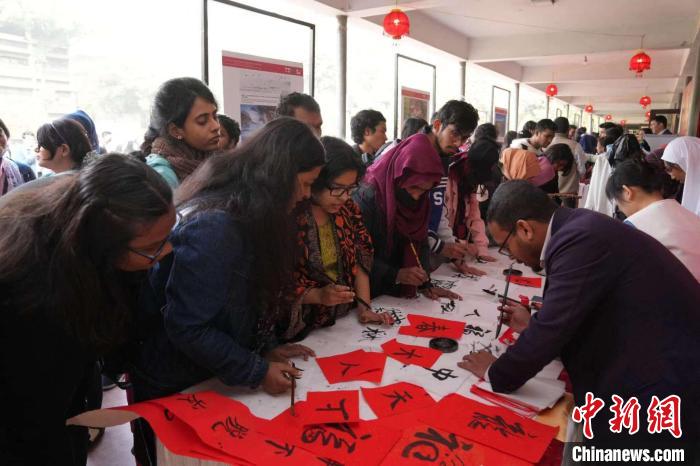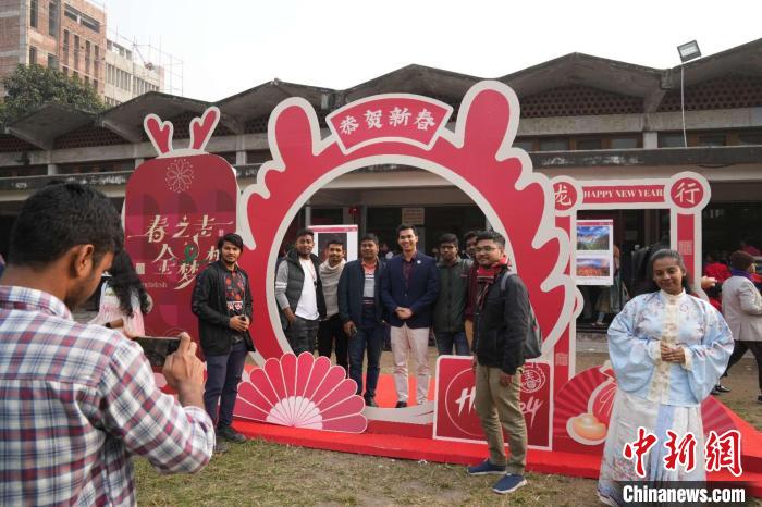 此次活動(dòng),受到達(dá)卡大學(xué)師生及當(dāng)?shù)孛癖姷臍g迎。數(shù)百份“?!弊?、春聯(lián)、年畫(huà)、中國(guó)結(jié)、燈籠,營(yíng)造濃濃的節(jié)日氛圍;近3000人次學(xué)生體驗(yàn)寫(xiě)福字、穿漢服等傳統(tǒng)文化;精彩的舞獅表演贏得陣陣喝彩;“恭賀新春”打卡區(qū)更是排起長(zhǎng)龍……