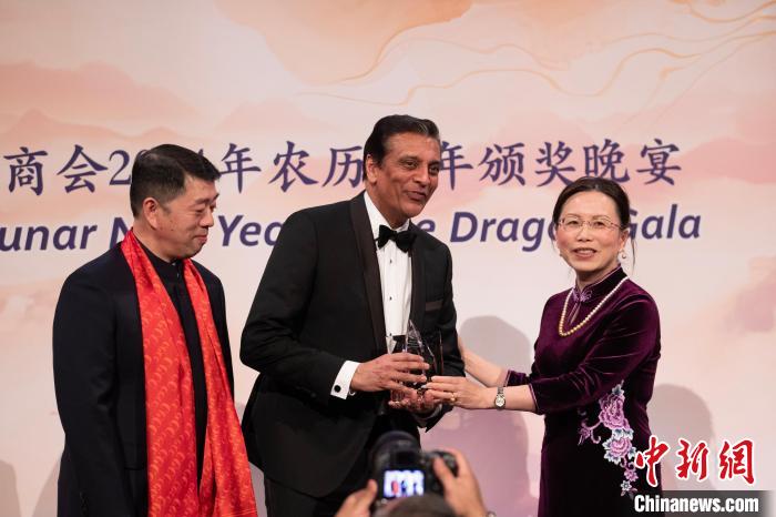 當?shù)貢r間1月18日,美國中國總商會(CGCC)在紐約舉行2024年農(nóng)歷龍年頒獎晚宴。圖為中國駐美國大使館公使徐學淵(右)為聯(lián)邦快遞總裁兼首席執(zhí)行官拉杰·蘇巴馬廉(中)頒發(fā)“國際領導力獎”?!≈行律缬浾?廖攀 攝