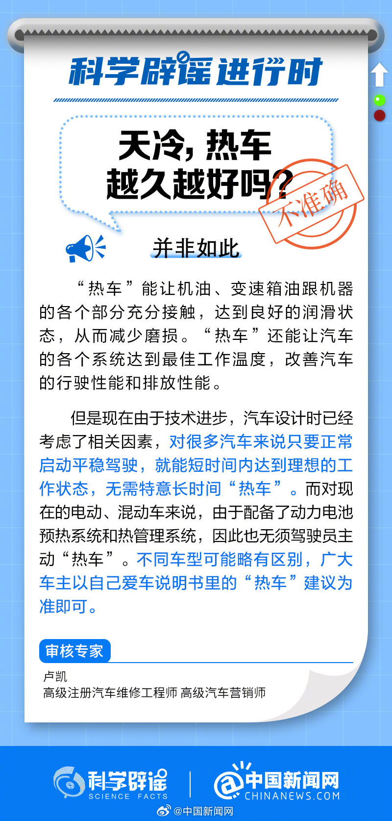 中新網(wǎng)1月23日電 “熱車”能讓機(jī)油、變速箱油跟機(jī)器的各個(gè)部分充分接觸,達(dá)到良好的潤滑狀態(tài),從而減少磨損?!盁彳嚒边€能讓汽車的各個(gè)系統(tǒng)達(dá)到最佳工作溫度,改善汽車的行駛性能和排放性能。但是現(xiàn)在由于技術(shù)進(jìn)步,汽車設(shè)計(jì)時(shí)已經(jīng)考慮了相關(guān)因素,對(duì)很多汽車來說只要正常啟動(dòng)平穩(wěn)駕駛,就能短時(shí)間內(nèi)達(dá)到理想的工作狀態(tài),無需特意長時(shí)間熱車。(來源:@科學(xué)辟謠 @中國新聞網(wǎng))