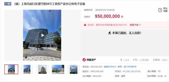 本次拍賣標的評估總價約為13.5億元,以9.5億元的價格起拍,約為評估總價的7折。拍賣于1月23日上午10時至1月24日上午10時止,雖然這場拍賣有超過1.3萬人圍觀,但最終無人出價,以流拍結(jié)束。