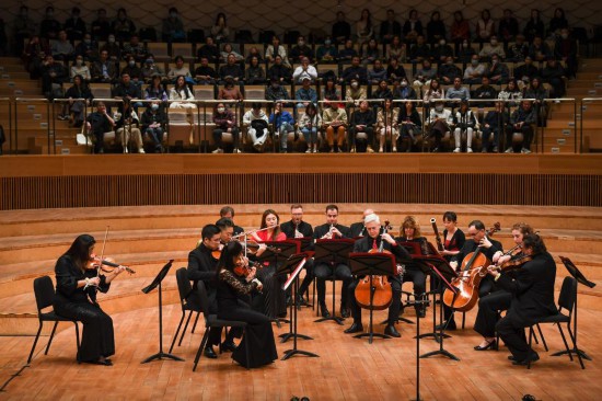 這是2023年11月16日拍攝的音樂會現(xiàn)場。當(dāng)日,“費(fèi)城之約”——費(fèi)城交響樂團(tuán)與蘇州交響樂團(tuán)室內(nèi)樂音樂會在江蘇蘇州舉行。新華社記者 李博 攝