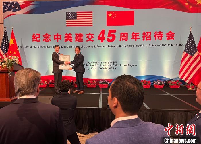 當(dāng)?shù)貢r間1月26日,中國駐洛杉磯總領(lǐng)事館舉辦紀(jì)念中美建交45周年招待會?!≈行律缬浾?張朔 攝