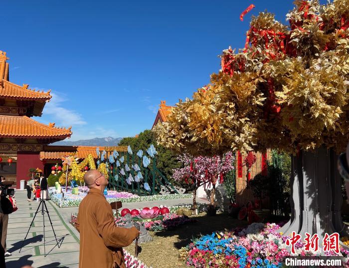 記者當(dāng)日在西來(lái)寺看到,大雄寶殿前,靈動(dòng)的“歡喜龍”主燈已搭建完成。平安燈會(huì)以“云水自在,祥和歡喜”為設(shè)計(jì)主題,祝福人們懷著喜悅的心情迎接新年。春節(jié)期間,寺院成佛大道兩旁還有龍?zhí)熳o(hù)佑、五福臨門行三好、百花齊放迎新春、諸事圓滿祈愿樹(shù)等景觀。