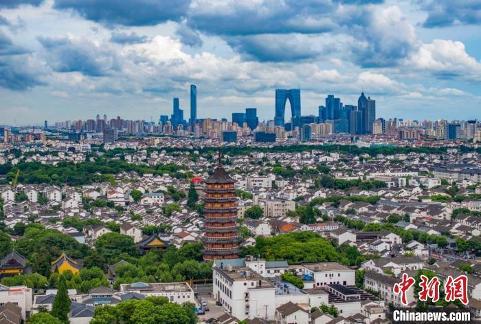 資料圖:蘇州古城近處的北寺塔與遠處的現(xiàn)代樓宇相呼應。 泱波 攝