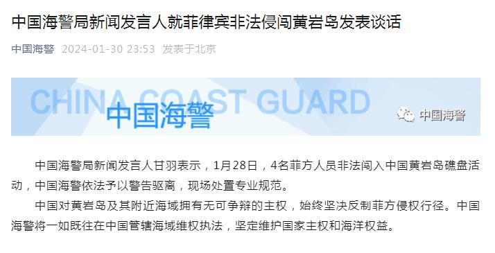 中新網(wǎng)1月31日電 據(jù)中國海警微信公眾號30日消息,中國海警局新聞發(fā)言人甘羽表示,1月28日,4名菲方人員非法闖入中國黃巖島礁盤活動,中國海警依法予以警告驅離,現(xiàn)場處置專業(yè)規(guī)范。
