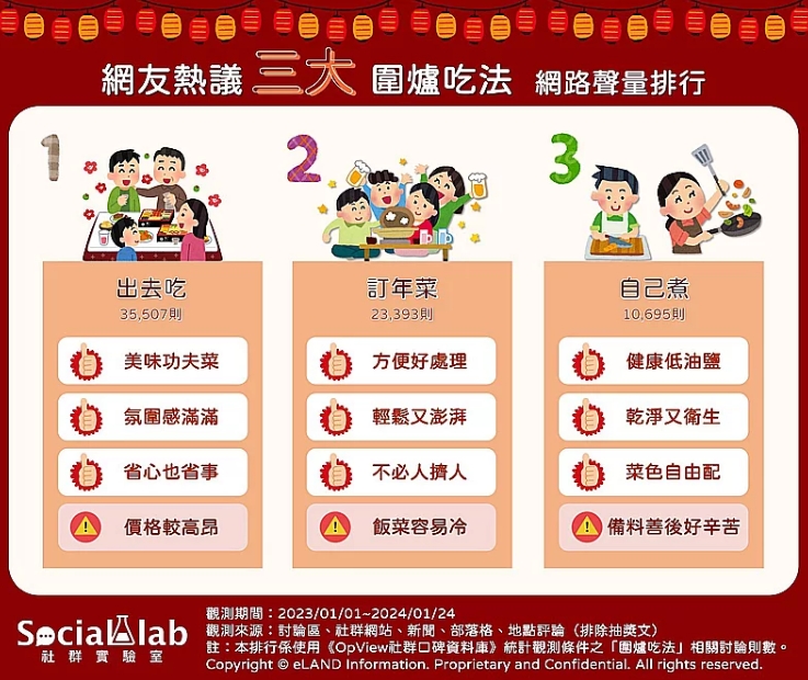 農歷新年即將到來,而重頭戲之一便是除夕時端上桌的年夜飯!觀察近一年臺灣網友針對“圍爐吃法”相關話題的討論,可以發(fā)現(xiàn)近年不少人為了避免自行下廚的繁復工程,紛紛選擇在除夕時出去吃年夜飯,只需一通電話預約,即可輕松享用美味的菜肴,省心又省事。