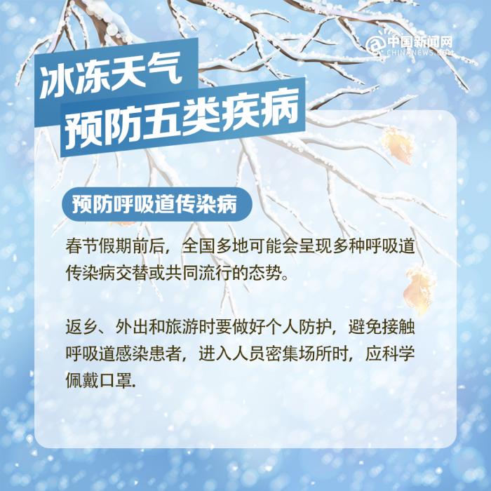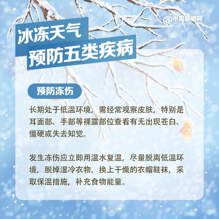 中新網(wǎng)北京2月7日電 近期我國(guó)中東部地區(qū)出現(xiàn)大范圍持續(xù)性低溫雨雪冰凍天氣過程,局部地區(qū)累計(jì)降雪量將接近或超過歷史同期,雨雪覆蓋范圍廣、持續(xù)時(shí)間長(zhǎng)、凍雨范圍大,雨雪冰凍災(zāi)害風(fēng)險(xiǎn)高,恰逢春節(jié)人員大規(guī)模流動(dòng),以下健康防護(hù)要點(diǎn)請(qǐng)查收。