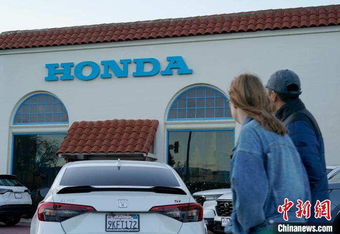 當(dāng)?shù)貢r間2月6日,行人從美國加州伯林格姆一家本田汽車銷售店附近經(jīng)過?!≈行律缬浾?劉關(guān)關(guān) 攝