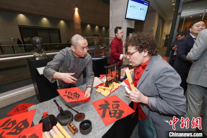 當(dāng)?shù)貢r間2月6日晚,加拿大蒙特利爾,中國駐蒙特利爾總領(lǐng)館與中國常駐國際民航組織理事會代表處在國際民航組織(ICAO)總部聯(lián)合舉辦“共慶春節(jié)”主題活動。圖為當(dāng)?shù)厝A人書法家(左)向與會嘉賓講解以中國書法書寫的“?!弊?。 中新社記者 余瑞冬 攝