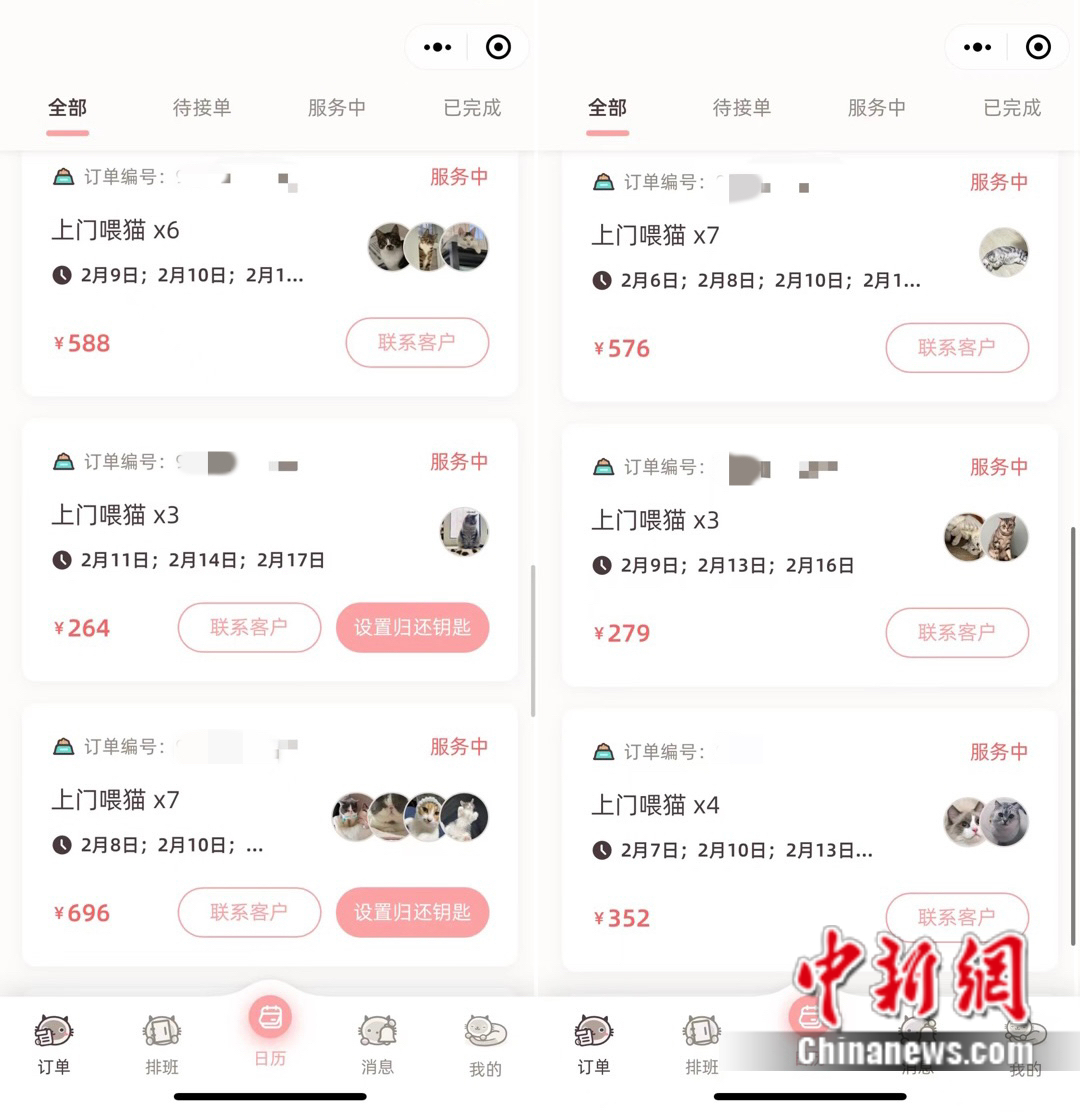 早在兩個(gè)月前,池女士就陸續(xù)接到了預(yù)約春節(jié)上門喂養(yǎng)的單子,到了1月底,由于訂單眾多,她不得不封單?!鞍创螖?shù)的話有超過150單了,好幾天都是一天20單?!卑垂?jié)假日平均80/次的價(jià)格來算,這個(gè)春節(jié)她將收入過萬。