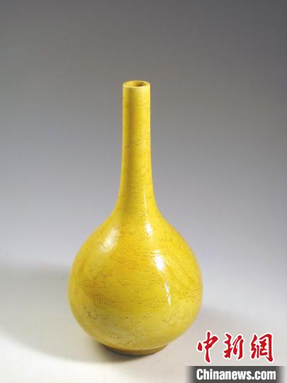 據(jù)沈陽故宮博物院研究館員李曉麗介紹,龍紋在發(fā)展過程中經(jīng)常和吉祥紋飾組合到一起。如清康熙款黃釉錐把瓶的口沿以下器身滿飾錐拱紋飾,暗刻流云、火焰圖案,瓶腹中部暗刻一龍一鳳形象,相向而飛,寓意“龍鳳呈祥”。腹下部近足處,有一圈海水紋飾。“這種暗刻紋龍鳳、流云、海水圖案,在康熙、雍正兩朝較為盛行。”
