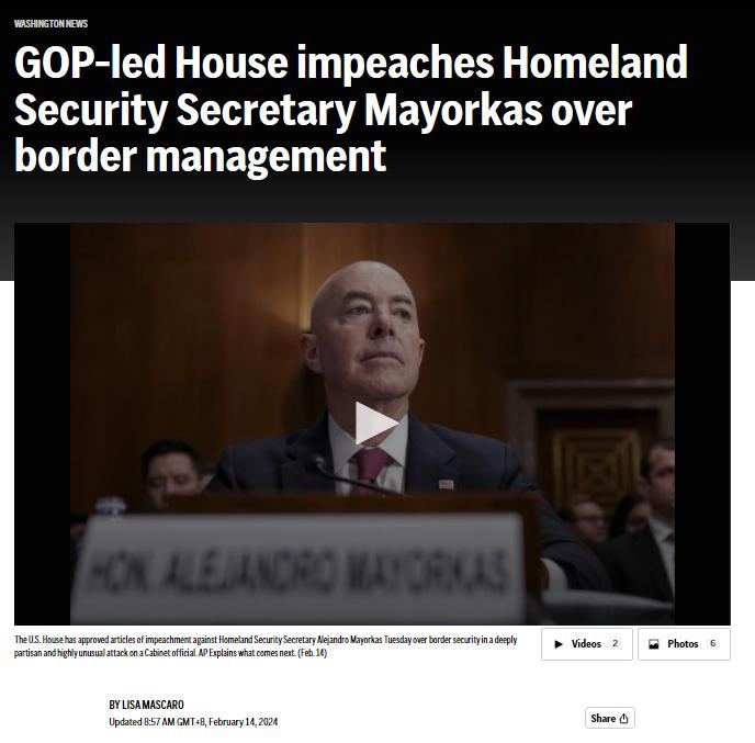 中新網(wǎng)2月14日電 綜合美媒報(bào)道,當(dāng)?shù)貢r間13日,美國眾議院批準(zhǔn)了針對邊境安全問題對國土安全部長馬約卡斯的彈劾條款,使他成為自1876年以來首位被眾議院彈劾的內(nèi)閣部長。