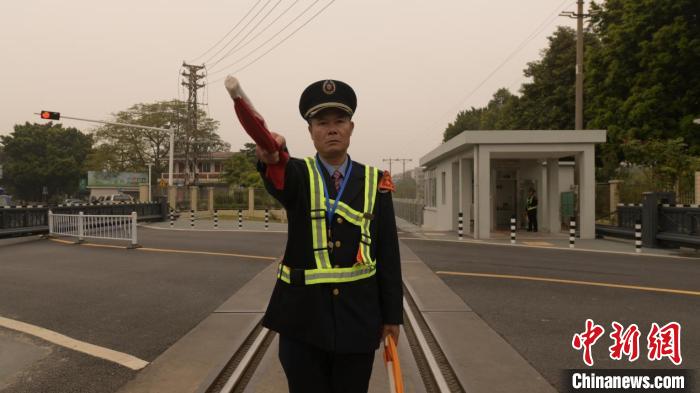 梁銘正在道口立崗接車。廣鐵集團(tuán)供圖
