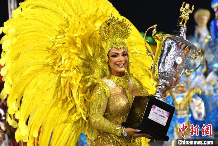 當(dāng)?shù)貢r(shí)間2月17日晚間,巴西圣保羅狂歡節(jié)冠軍隊(duì)重返桑巴大道做收官游行演出。圖為一名桑巴舞校演員展示獎(jiǎng)杯。記者林春茵攝
