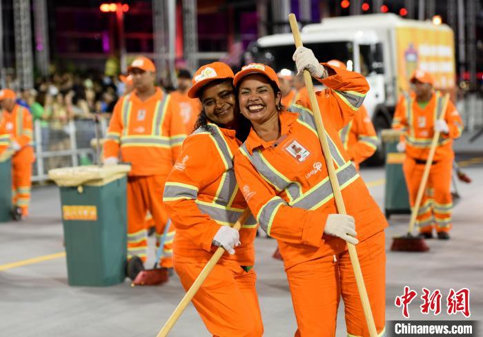 清潔工以方陣之姿踏入巴西圣保羅狂歡節(jié)冠軍隊(duì)收官巡演現(xiàn)場(chǎng)。記者林春茵攝