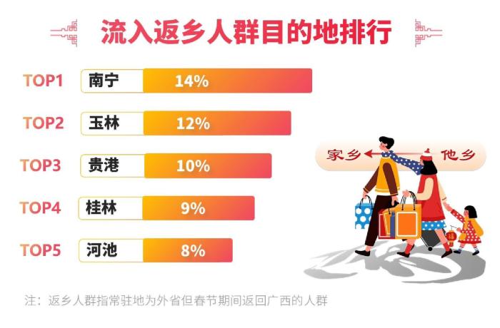春節(jié)期間,廣西迎來(lái)客流高峰。據(jù)統(tǒng)計(jì),廣西流入客流同比增長(zhǎng)7%,流出客流同比增長(zhǎng)18%,凈增客流超過(guò)1000萬(wàn)人。其中,返桂人潮占比25%,男性成為返鄉(xiāng)主力,占比58%。“80后”和“90后”人群成為返鄉(xiāng)主流,占比超過(guò)50%。交通出行方面,短途游備受青睞,200-500公里出行占比達(dá)到48%,汽車(chē)成為首選出行方式。