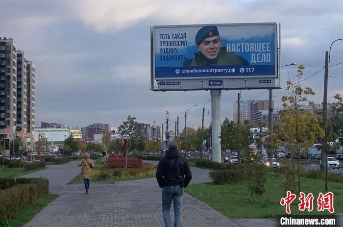 2023年10月,俄羅斯圣彼得堡街道上的征兵海報(bào)?!≈行律缬浾?商永 攝